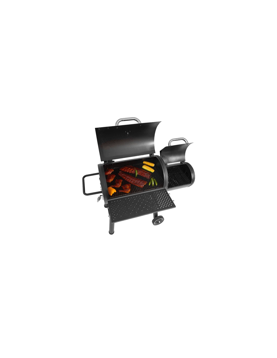 Le bâti du Smoker Offset 500 est fabriqué en acier de 2 mm, et offre une surface totale de cuisson de 6 419 cm², et des grilles de cuisson en fonte émaillée réversibles.