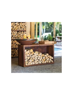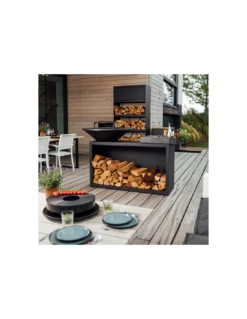 Très pratique, le socle de l’Ofyr Island permet de stocker le bois et offre un large plan de travail avec un billot pour effectuer vos découpes. A table !!!Â