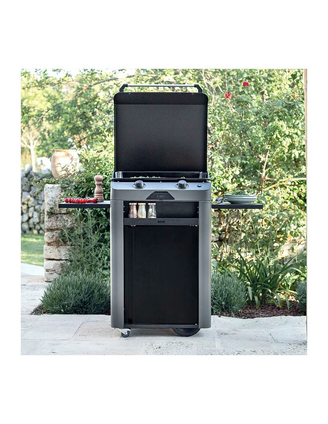 – 2 grandes roues tout terrain + 2 roulettes pivotantes Ă frein