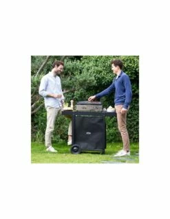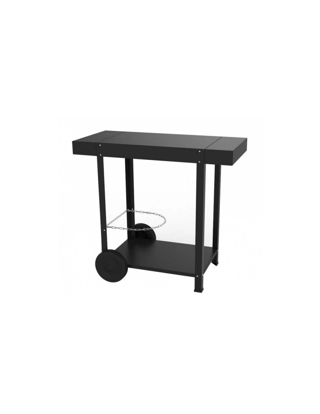 Chariot en acier galvanisĂ© thermolaquĂ© noir – 2 tablettes latĂ©rales avec accroche ustensiles – 2 roues – 2 rideaux cache bouteille