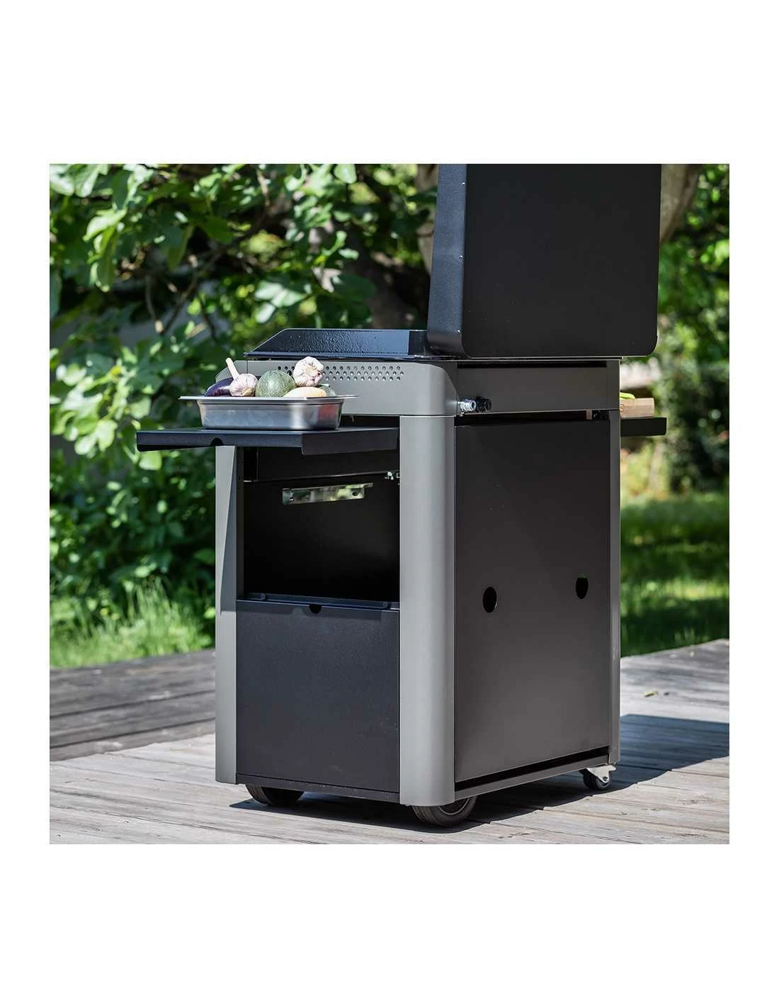 Le chariot utilitaire est Ă©galement pratique pour cuisiner autour de la plancha. Deux Ă©tagères pliantes vous permettent de couper et de ranger vos courses. L’avant du chariot dispose Ă©galement d’un emplacement pour ranger facilement les Ă©pices. Il y a aussi un espace derrière la porte pour ranger la bonbonne de gaz qui alimente la plancha.