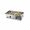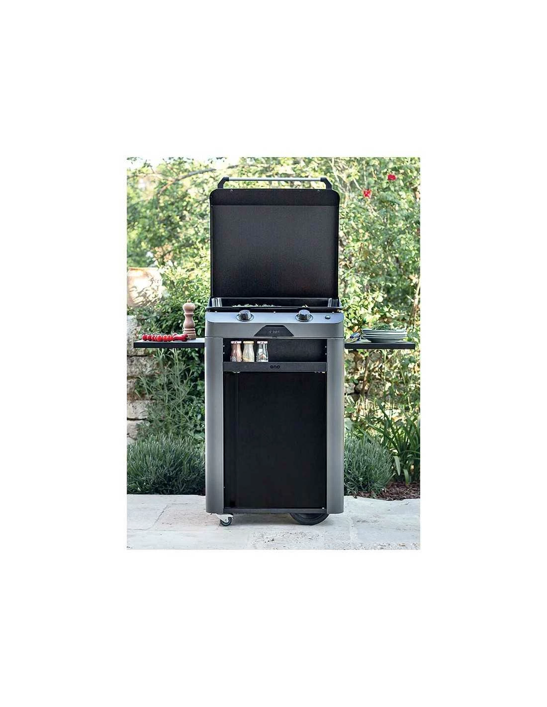– Plancha gaz 2 feux en fonte émaillée pour 6 à 8 personnes, encastrée dans un chariot qui comporte 2 tablettes rabattables et qui est fermé par 2 rideaux noirs pour cacher la bouteille de gaz.