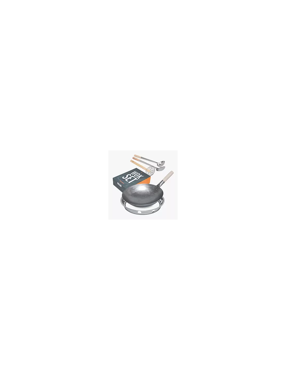 L‘ensemble de cuisson WOK comprend le WOK, le support de casserole, une louche, un tamis et une spatule.